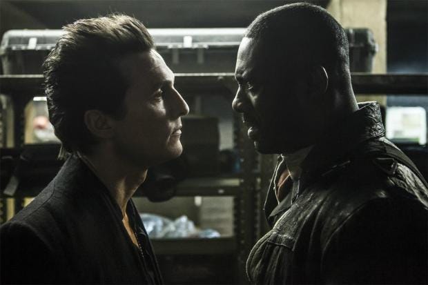 Честно признаюсь, я не просто никогда не читал "Темную башню" Кинга, но до первых новостей о решении экранизировать цикл и не слышал о ней ни разу. И являясь наблюдателем как бы со стороны не могу не отметить, что фанатские бурления казались мне явно чрезмерными. Помню скандал галактического масштаба, когда стало известно, что роль Роланда Дискейна получит Идрис Эльба. Я же, повторюсь, книгу не читал, а Эльба, как актер, мне нравился еще со времен "Лютера". Помню тысячи гневным комментариев к первым трейлерам, из которых я узнал лишь то, что главным антагонистом станет один из лучших актеров на сегодняшний день Мэттью МакКонахи. Соответственно к премьере у меня не было вообще никаких требований и вообще никаких ожиданий. Я ее, считайте, что и не ждал совсем. Поэтому сказать, что я был разочарован после просмотра, не могу. Не был. Но вполне понимаю чувства фанатов книжного первоисточника, фильм получился мягко говоря не безгрешным.